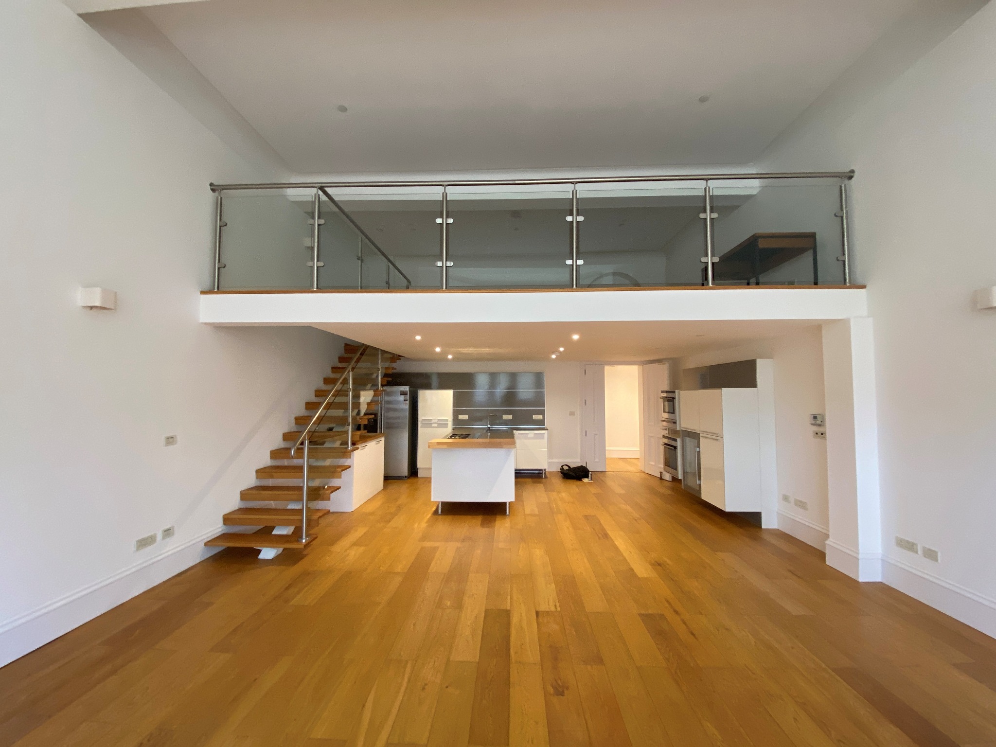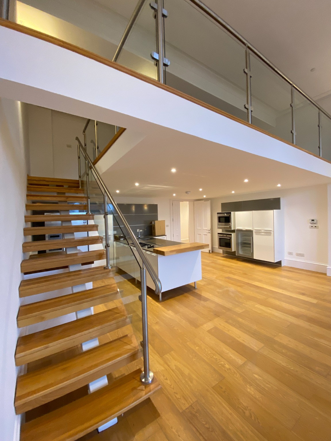 This beautiful property comprises a welcoming entrance hallway with storage cupboard, dual height open plan living room/kitchen with striking arched windows, the fully fitted kitchen offers an array of integrated appliances and centre island. A focal point central stringer stair with timber treads and glass/aluminium balustrade leads from the living room to an impressive glass fronted mezzanine overlooking the living room, which would be an ideal office space or potential third bedroom. There are two well proportioned double bedrooms both featuring ample wardrobe space and the master boasts an en-suite bathroom with shower over bath. A further shower room off the hall completes the internal accommodation.