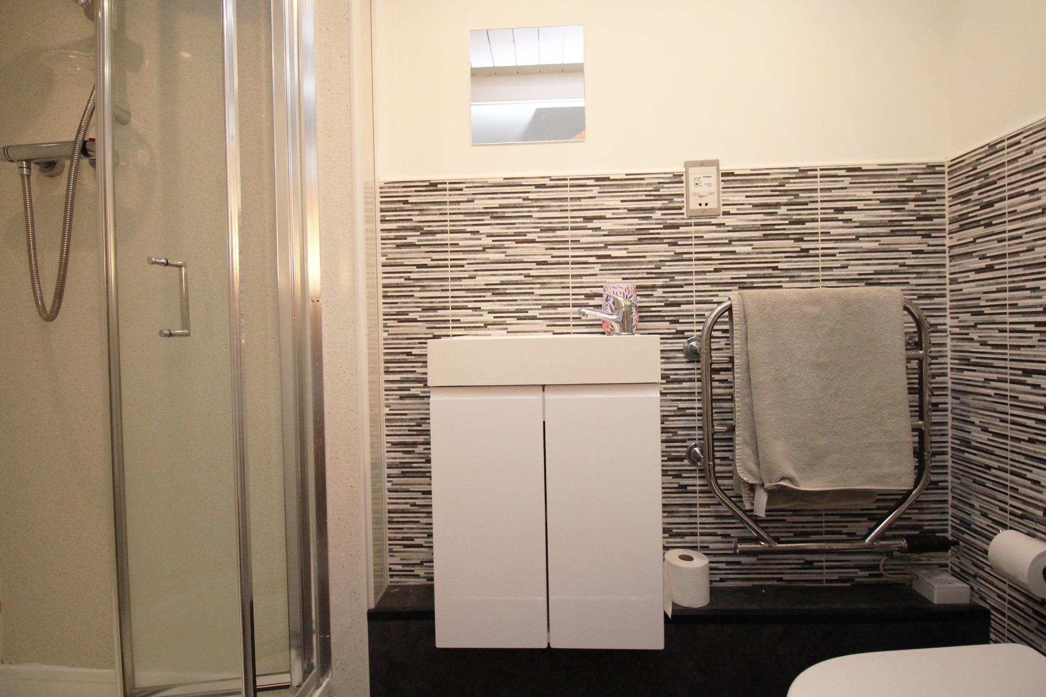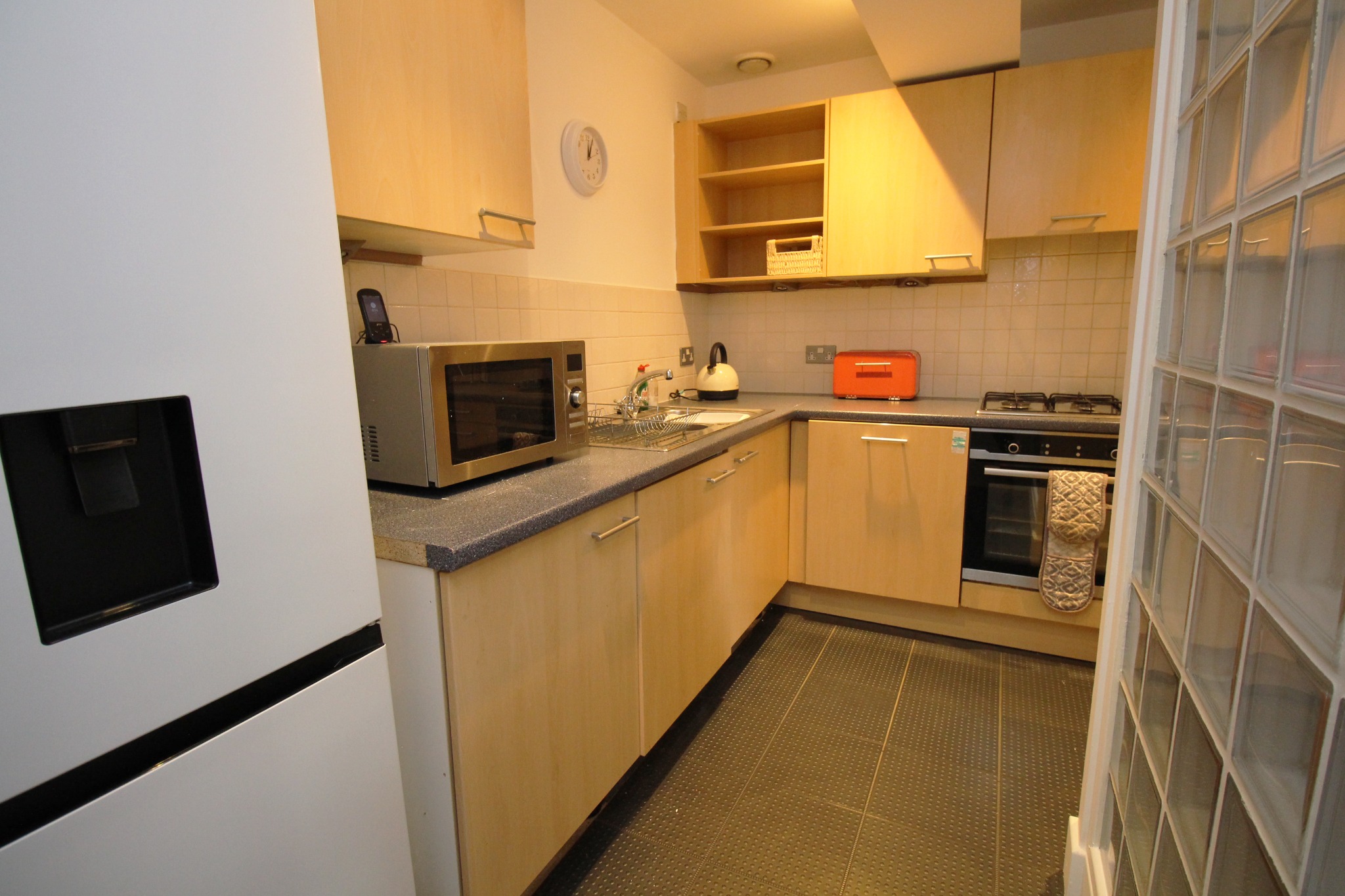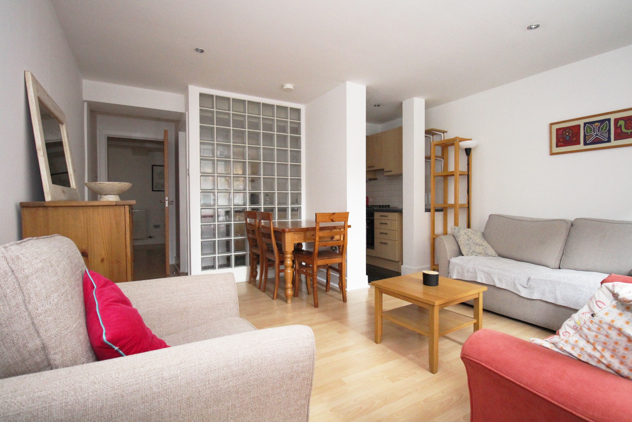 This property comprises an entrance hallway with ample storage, a master bedroom with an en-suite shower, two further double bedrooms with built-in storage, and a modern kitchen with appliances, separated from the living room by a glass partition. There is also a second bathroom with a shower over the bath.